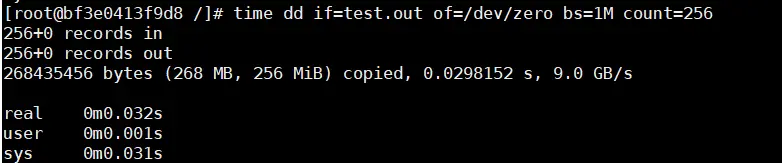 在不加iflag=direct的情况下进行测试,发现读取速度为9.0GB/s远大于15.8MB/s,说明限制容器读取次数成功。