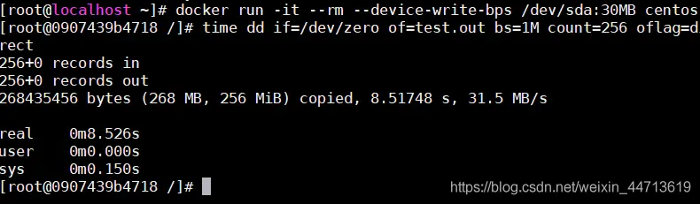 docker run -it --rm --device-write-bps /dev/sda:30MB centos