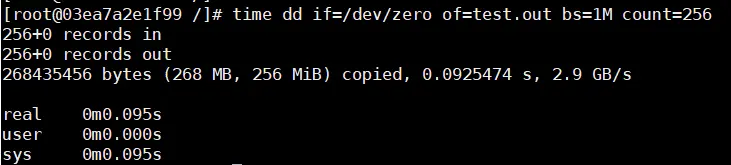 在容器内采用dd命令对容器的写入速度进行测试,验证其读写速度在30M左右。首先需要生成读取数据文件test.out。