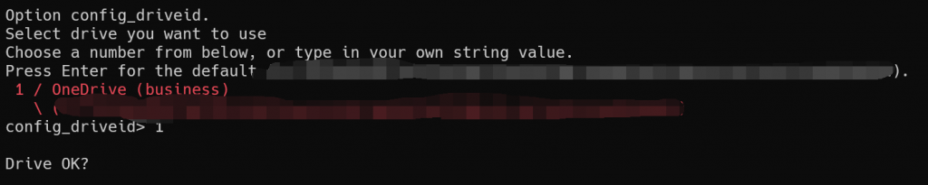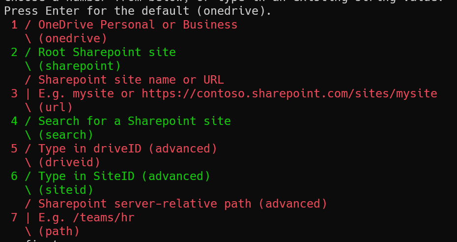 然后会要求选择要挂载的网盘,找到 Microsoft OneDrive 并输入其前面的序号(可以直接输入onedrive)